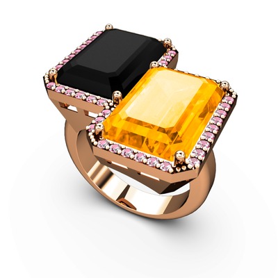 Siyah zirkon, sitrin ve pembe kuvars 8 ayar rose altın yüzük