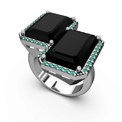 Siyah zirkon ve yeşil kuvars 18 ayar beyaz altın yüzük