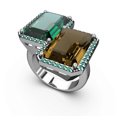 Yeşil kuvars ve dumanlı kuvars 18 ayar beyaz altın yüzük