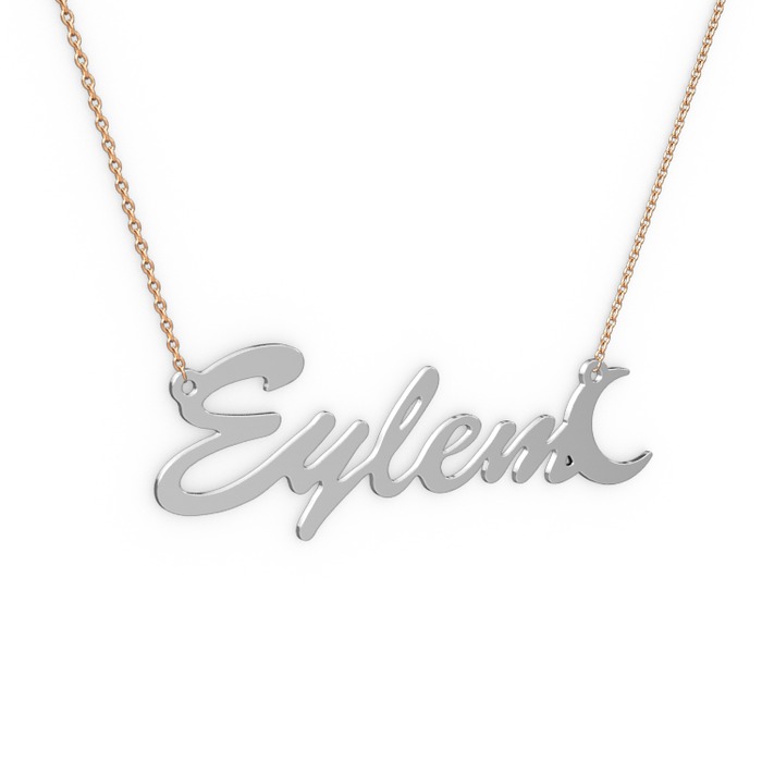8 ayar beyaz altın kolye (5 karakterli el yazısı, 40 cm rose altın rolo zincir)