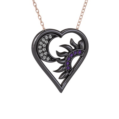 Beyaz zirkon ve ametist 925 ayar siyah rodyum kaplama gümüş kolye (40 cm rose altın rolo zincir)