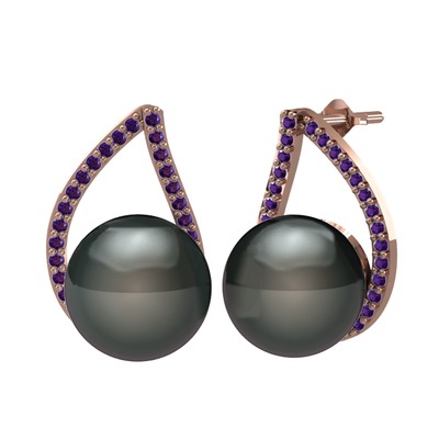 Siyah inci ve ametist 8 ayar rose altın küpe