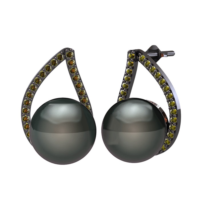 Siyah inci ve peridot 925 ayar siyah rodyum kaplama gümüş küpe