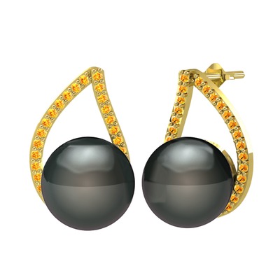 Siyah inci ve sitrin 18 ayar altın küpe