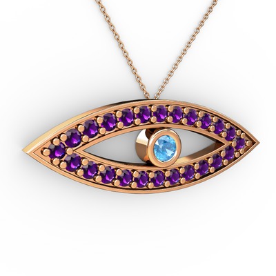 Akuamarin ve ametist 925 ayar rose altın kaplama gümüş kolye (40 cm rose altın rolo zincir)