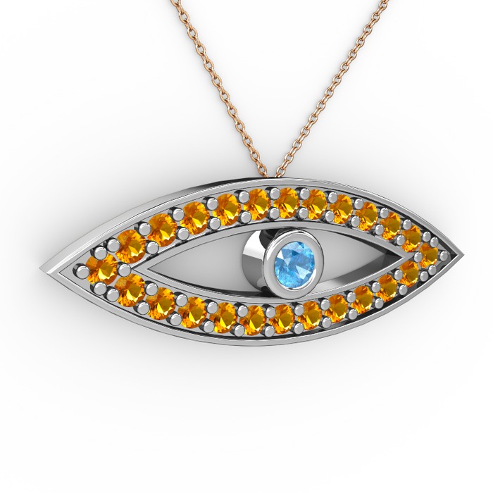 Akuamarin ve sitrin 14 ayar beyaz altın kolye (40 cm rose altın rolo zincir)