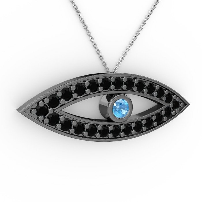 Akuamarin ve siyah zirkon 925 ayar siyah rodyum kaplama gümüş kolye (40 cm beyaz altın rolo zincir)
