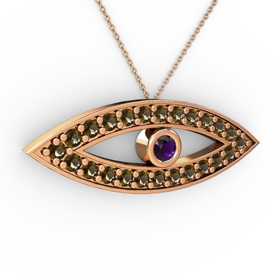 Ametist ve dumanlı kuvars 14 ayar rose altın kolye (40 cm gümüş rolo zincir)