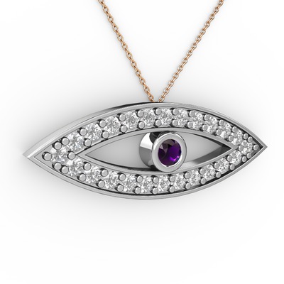 Ametist ve pırlanta 14 ayar beyaz altın kolye (0.264 karat, 40 cm rose altın rolo zincir)