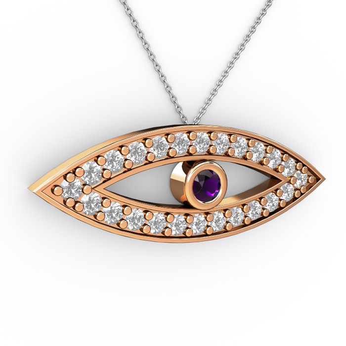 Ametist ve pırlanta 925 ayar rose altın kaplama gümüş kolye (0.264 karat, 40 cm gümüş rolo zincir)