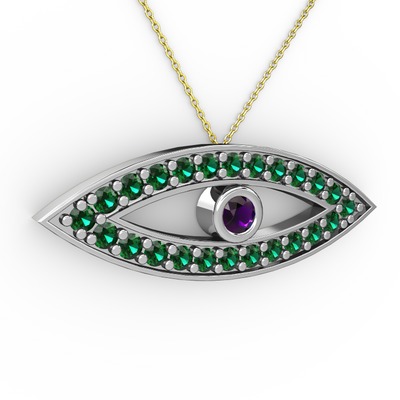 Ametist ve yeşil kuvars 14 ayar beyaz altın kolye (40 cm gümüş rolo zincir)