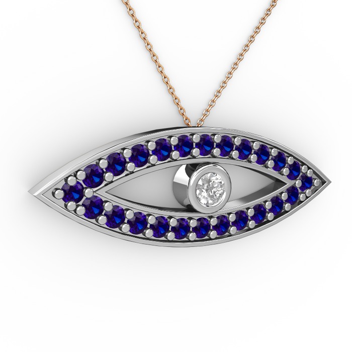 Beyaz zirkon ve lab safir 18 ayar beyaz altın kolye (40 cm rose altın rolo zincir)