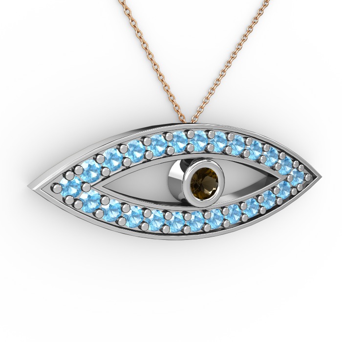 Dumanlı kuvars ve akuamarin 18 ayar beyaz altın kolye (40 cm rose altın rolo zincir)