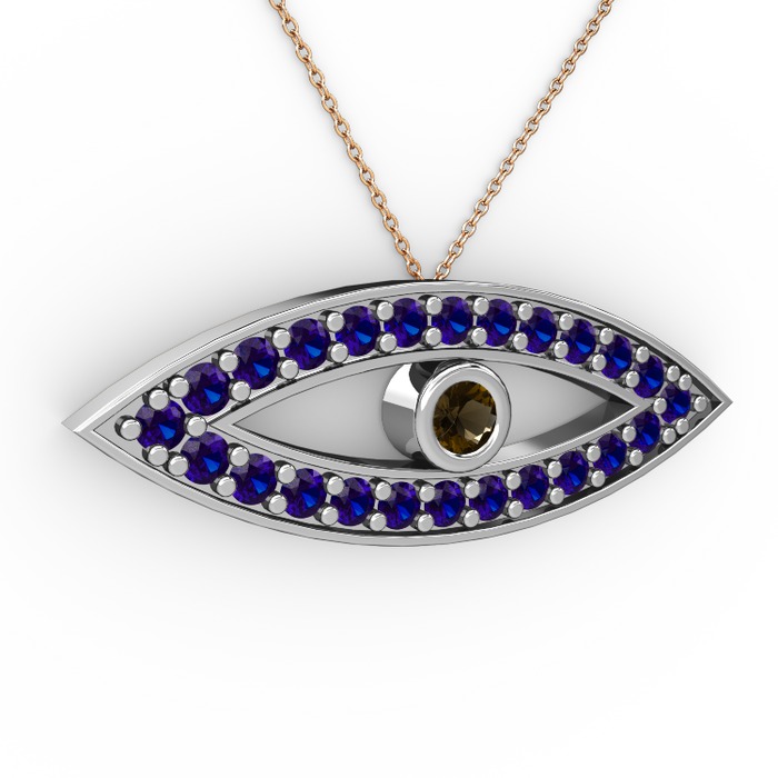 Dumanlı kuvars ve lab safir 18 ayar beyaz altın kolye (40 cm rose altın rolo zincir)
