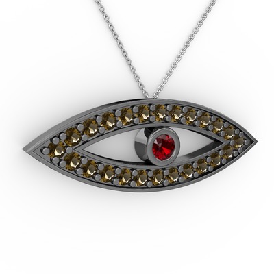 Garnet ve dumanlı kuvars 925 ayar siyah rodyum kaplama gümüş kolye (40 cm beyaz altın rolo zincir)