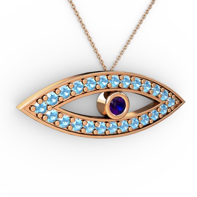 Lab safir ve akuamarin 14 ayar rose altın kolye (40 cm rose altın rolo zincir)