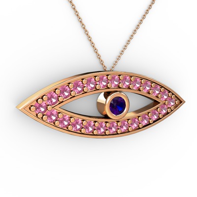 Lab safir ve pembe kuvars 14 ayar rose altın kolye (40 cm rose altın rolo zincir)