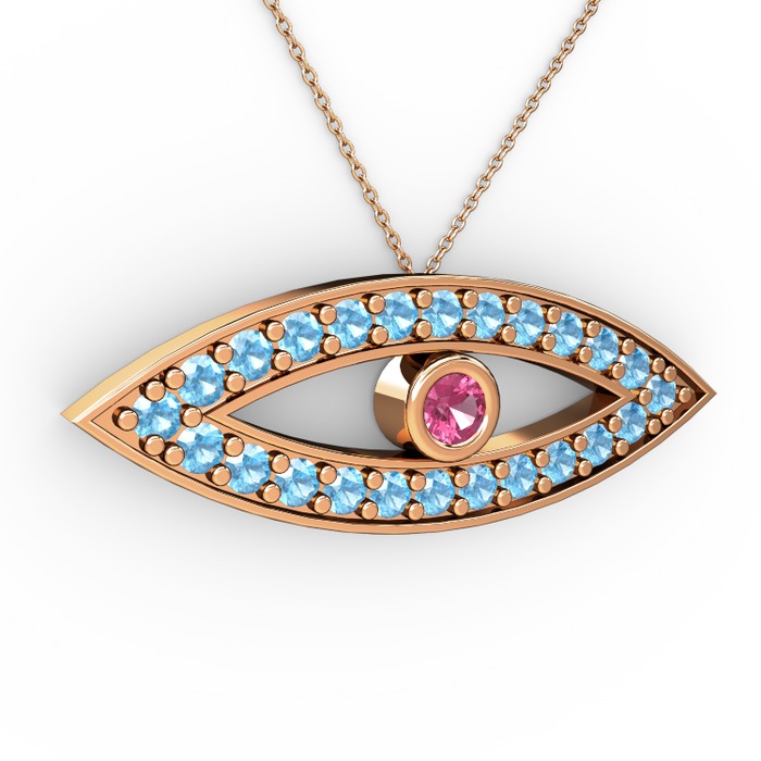 Pembe kuvars ve akuamarin 8 ayar rose altın kolye (40 cm gümüş rolo zincir)