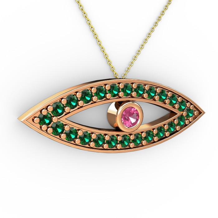 Pembe kuvars ve yeşil kuvars 925 ayar rose altın kaplama gümüş kolye (40 cm altın rolo zincir)