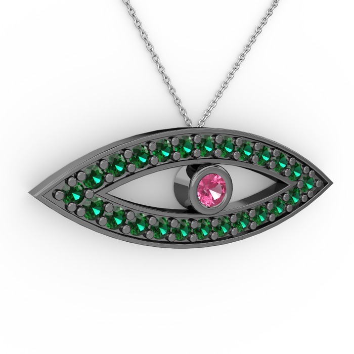 Pembe kuvars ve yeşil kuvars 925 ayar siyah rodyum kaplama gümüş kolye (40 cm gümüş rolo zincir)