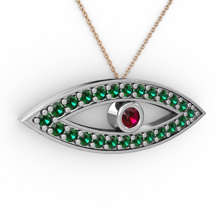 Rodolit garnet ve yeşil kuvars 14 ayar beyaz altın kolye (40 cm rose altın rolo zincir)