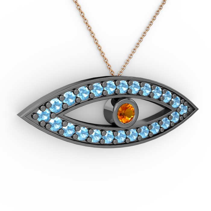 Sitrin ve akuamarin 925 ayar siyah rodyum kaplama gümüş kolye (40 cm rose altın rolo zincir)