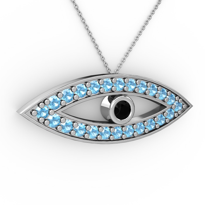 Siyah zirkon ve akuamarin 8 ayar beyaz altın kolye (40 cm gümüş rolo zincir)