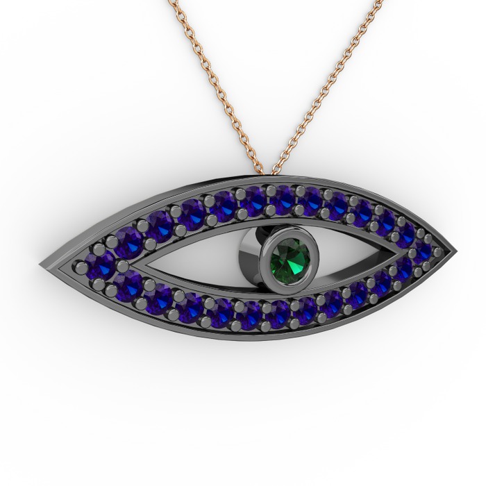 Yeşil kuvars ve lab safir 925 ayar siyah rodyum kaplama gümüş kolye (40 cm rose altın rolo zincir)
