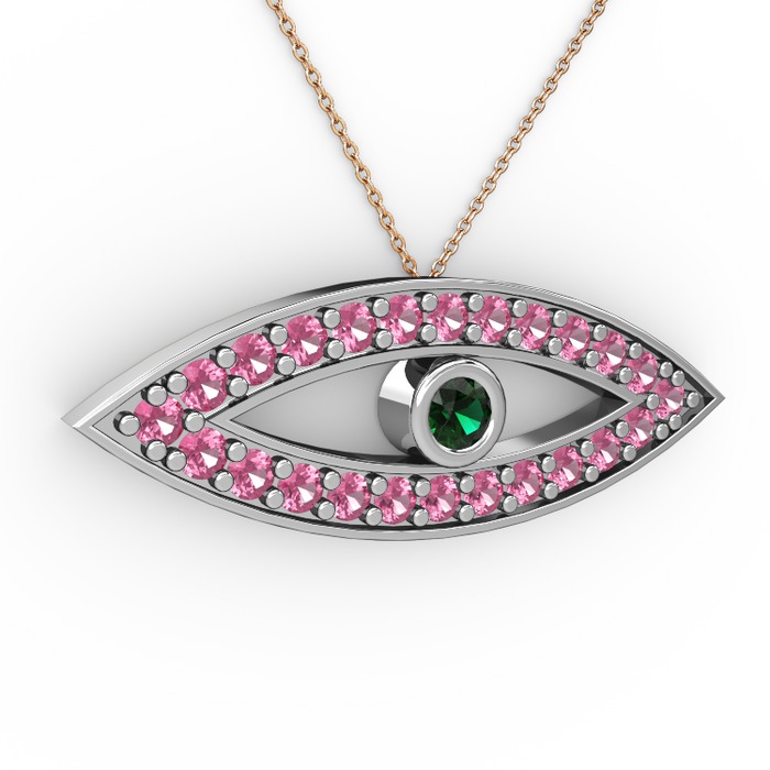 Yeşil kuvars ve pembe kuvars 14 ayar beyaz altın kolye (40 cm rose altın rolo zincir)