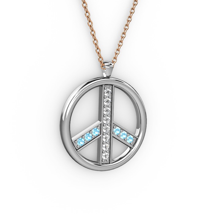 Pırlanta ve akuamarin 14 ayar beyaz altın kolye (0.12 karat, 40 cm rose altın rolo zincir)