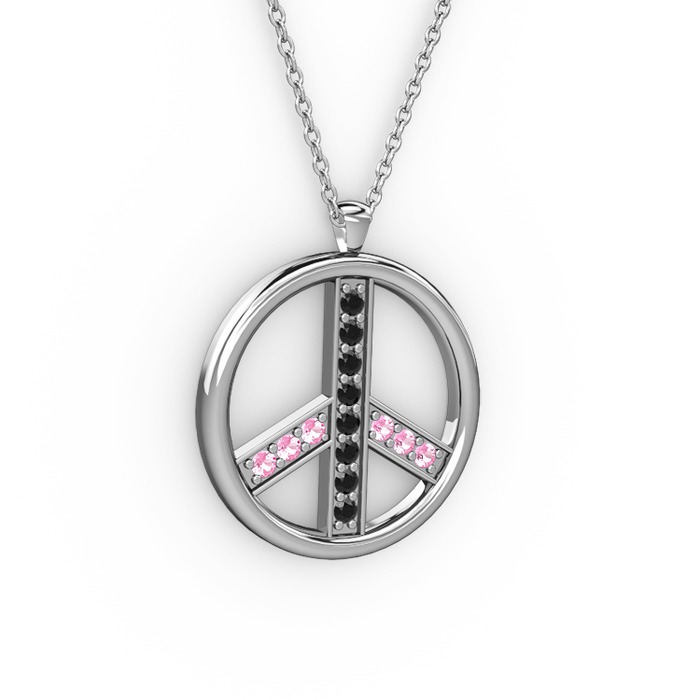 Siyah zirkon ve pembe kuvars 14 ayar beyaz altın kolye (40 cm beyaz altın rolo zincir)