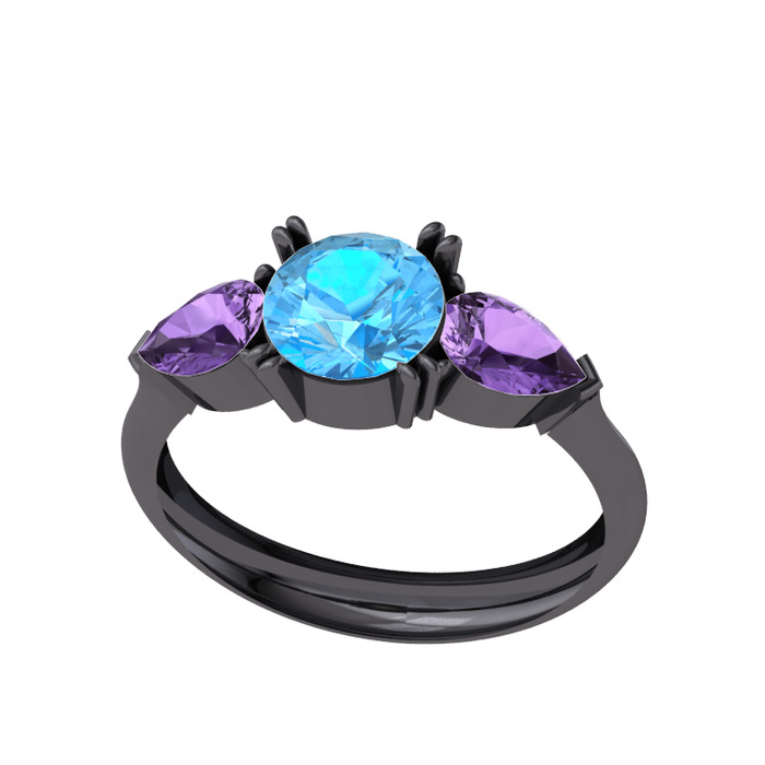 Akuamarin ve ametist 925 ayar siyah rodyum kaplama gümüş yüzük