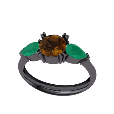 Dumanlı kuvars ve kök zümrüt 925 ayar siyah rodyum kaplama gümüş yüzük