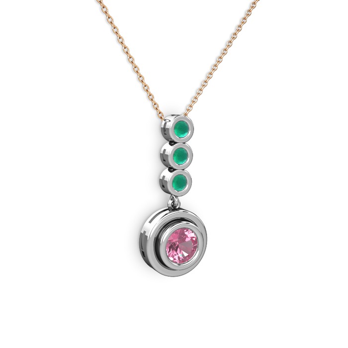 Pembe kuvars ve kök zümrüt 14 ayar beyaz altın kolye (40 cm rose altın rolo zincir)