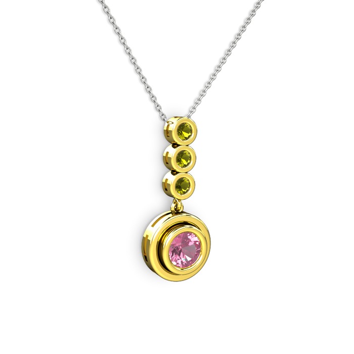 Pembe kuvars ve peridot 14 ayar altın kolye (40 cm gümüş rolo zincir)
