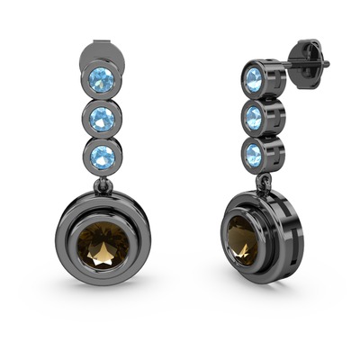 Akuamarin ve dumanlı kuvars 925 ayar siyah rodyum kaplama gümüş küpe