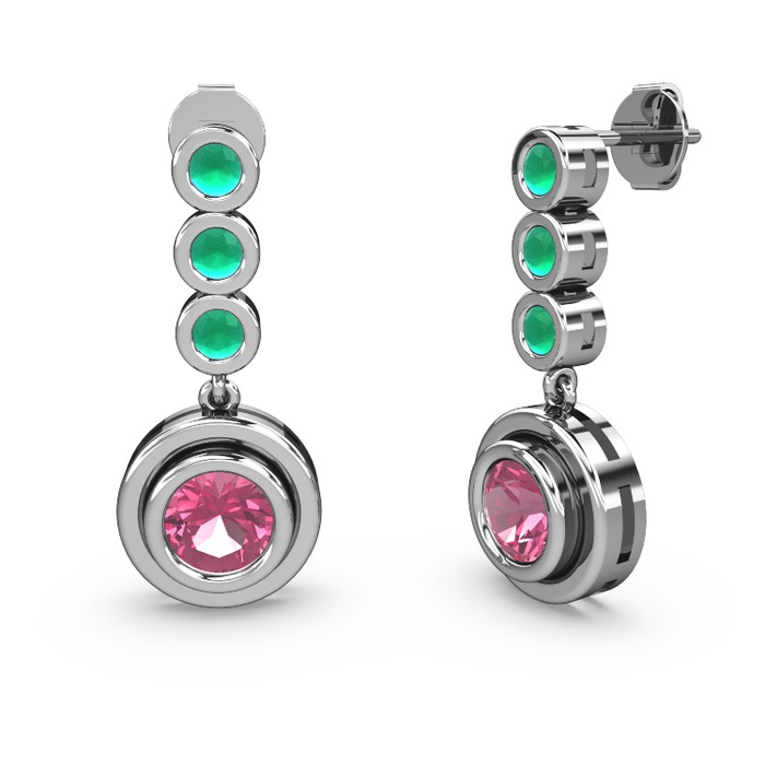 Kök zümrüt ve pembe kuvars 14 ayar beyaz altın küpe