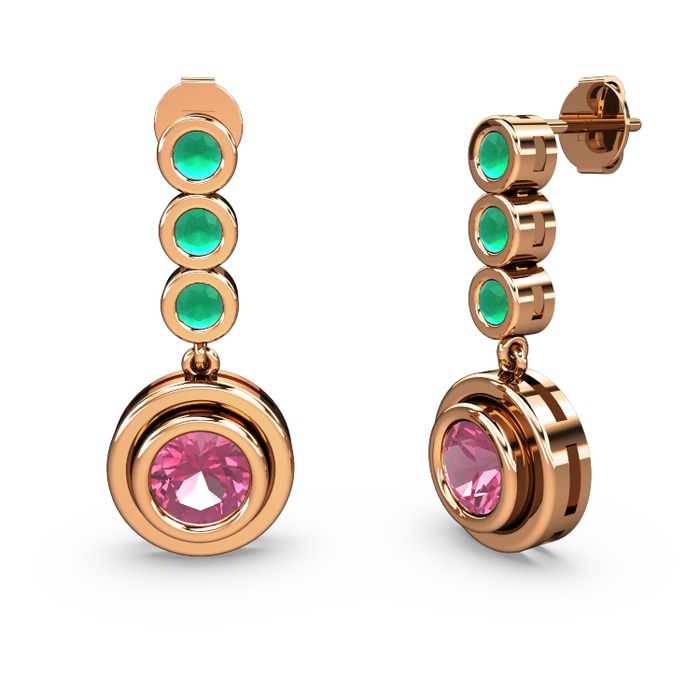 Kök zümrüt ve pembe kuvars 14 ayar rose altın küpe