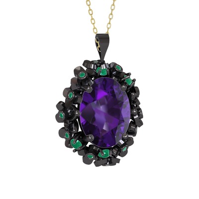 Ametist ve kök zümrüt 925 ayar siyah rodyum kaplama gümüş kolye (40 cm altın rolo zincir)