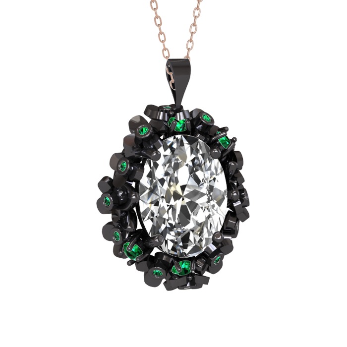 Beyaz zirkon ve yeşil kuvars 925 ayar siyah rodyum kaplama gümüş kolye (40 cm rose altın rolo zincir)