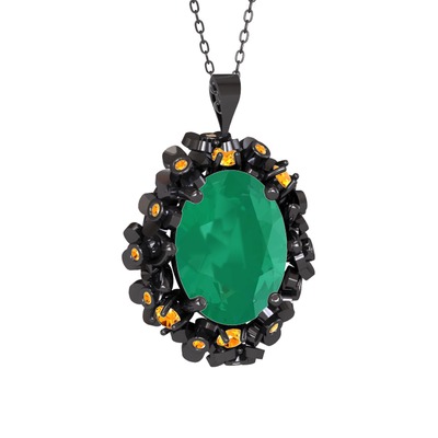 Kök zümrüt ve sitrin 925 ayar siyah rodyum kaplama gümüş kolye (40 cm gümüş rolo zincir)