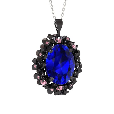 Lab safir ve pembe kuvars 925 ayar siyah rodyum kaplama gümüş kolye (40 cm beyaz altın rolo zincir)