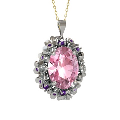 Pembe kuvars ve ametist 18 ayar beyaz altın kolye (40 cm altın rolo zincir)