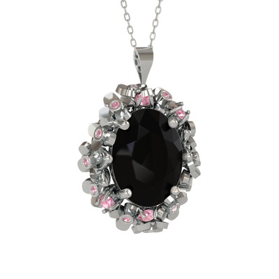 Siyah zirkon ve pembe kuvars 18 ayar beyaz altın kolye (40 cm beyaz altın rolo zincir)