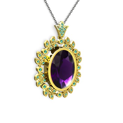Ametist ve yeşil kuvars 14 ayar altın kolye (40 cm gümüş rolo zincir)