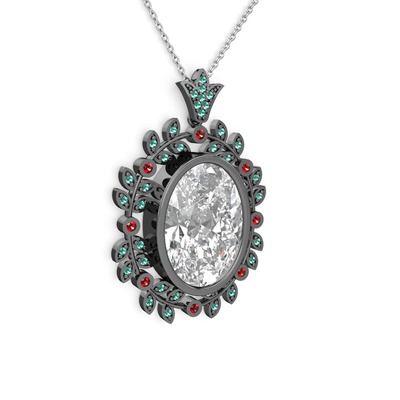 Beyaz zirkon, yeşil kuvars ve garnet 925 ayar siyah rodyum kaplama gümüş kolye (40 cm gümüş rolo zincir)
