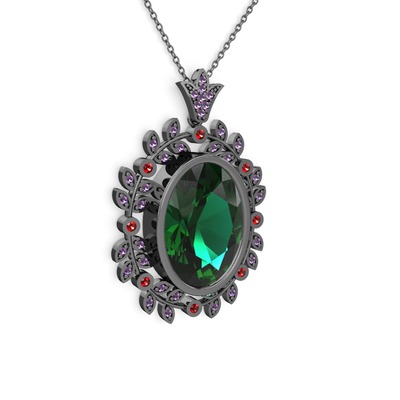 Yeşil kuvars, ametist ve garnet 925 ayar siyah rodyum kaplama gümüş kolye (40 cm gümüş rolo zincir)
