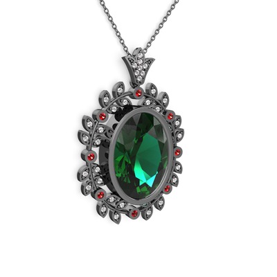 Yeşil kuvars, beyaz zirkon ve garnet 925 ayar siyah rodyum kaplama gümüş kolye (40 cm gümüş rolo zincir)