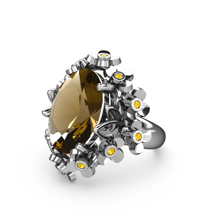 Dumanlı kuvars ve sitrin 18 ayar beyaz altın yüzük