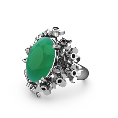 Kök zümrüt ve siyah zirkon 8 ayar beyaz altın yüzük